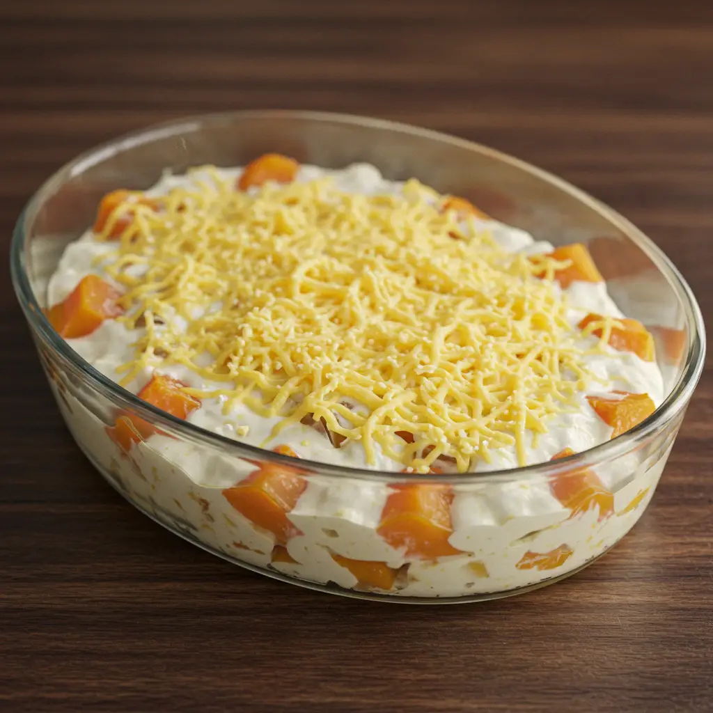 Despeje a abóbora amassada sobre o requeijão e, em seguida, o frango com o molho.