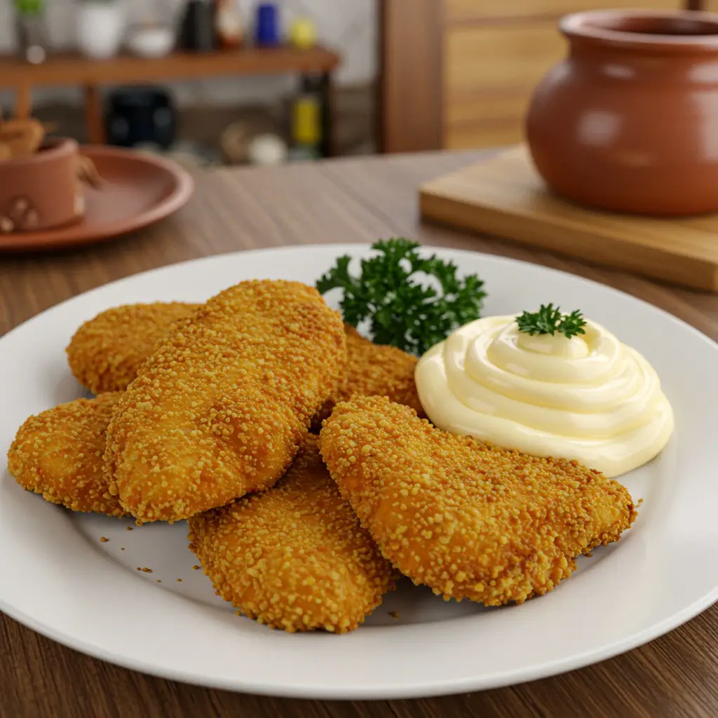 Delicioso frango empanado crocante, perfeito para um lanche ou almoço, servido com uma maionese caseira que dá um toque especial à refeição.