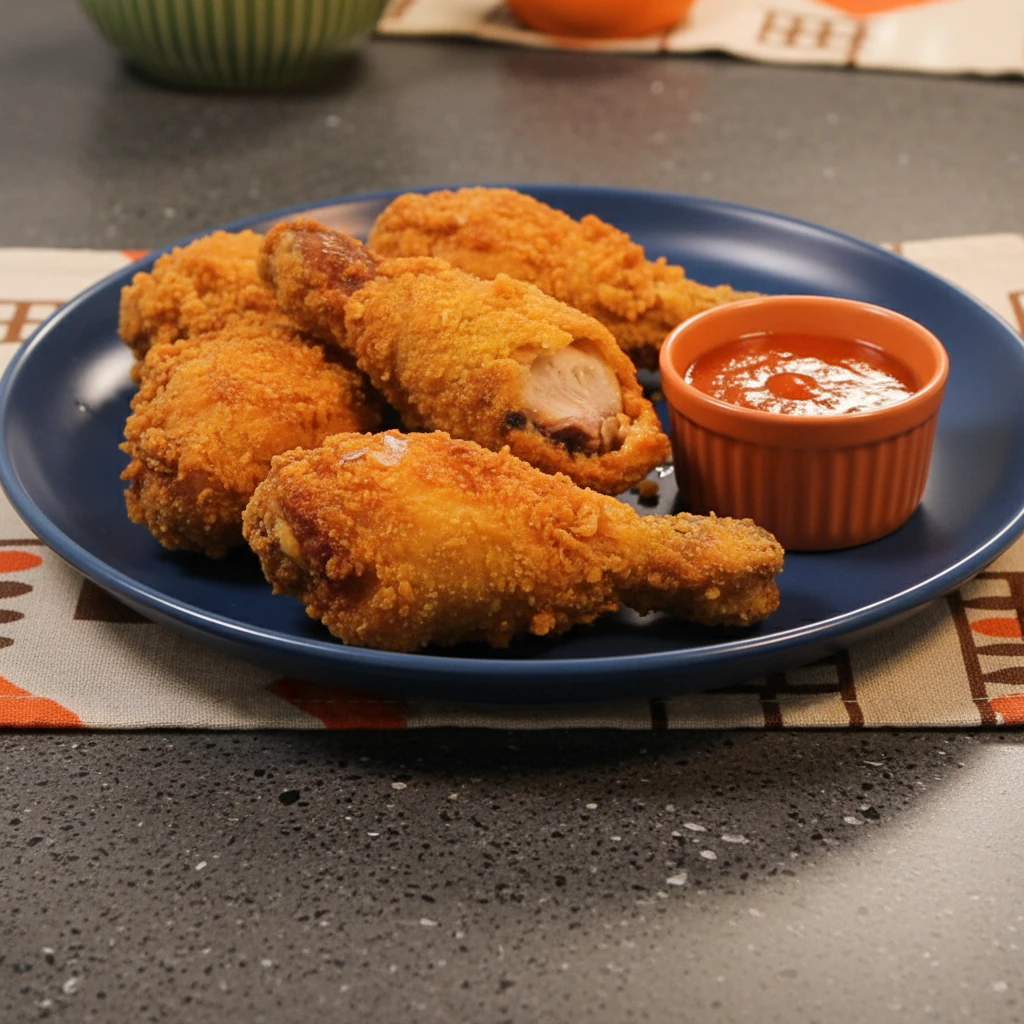 Um frango empanado com casquinha incrivelmente crocante! Três camadas de empanamento garantem textura irresistível. Perfeito para um almoço ou jantar especial, acompanhado de um molho picante.
