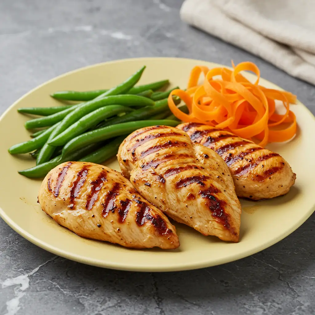 Delicioso frango grelhado, suculento e saboroso, acompanhado de legumes frescos e vibrantes. Uma opção leve e saudável para um jantar especial.