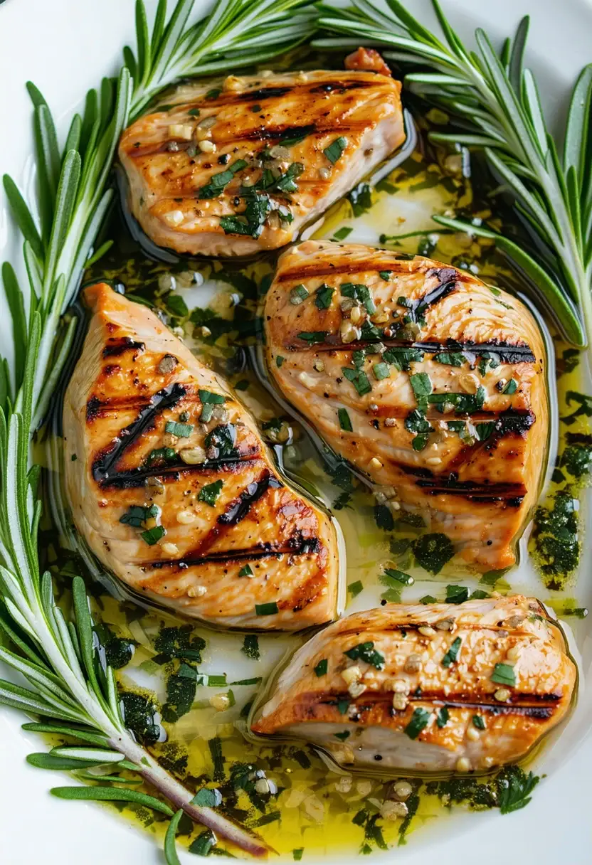Frango grelhado suculento marinado com uma mistura de ervas frescas para uma refeição saborosa. Perfeito para um churrasco de verão ou jantar em família.
