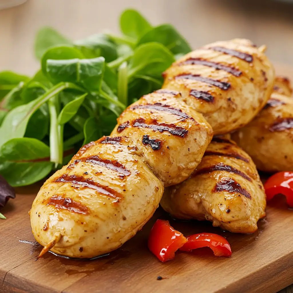 Deliciosos filés de frango grelhados no espeto, com um saboroso molho de vinho branco, ervas e especiarias. Uma receita fácil e perfeita para um jantar especial.