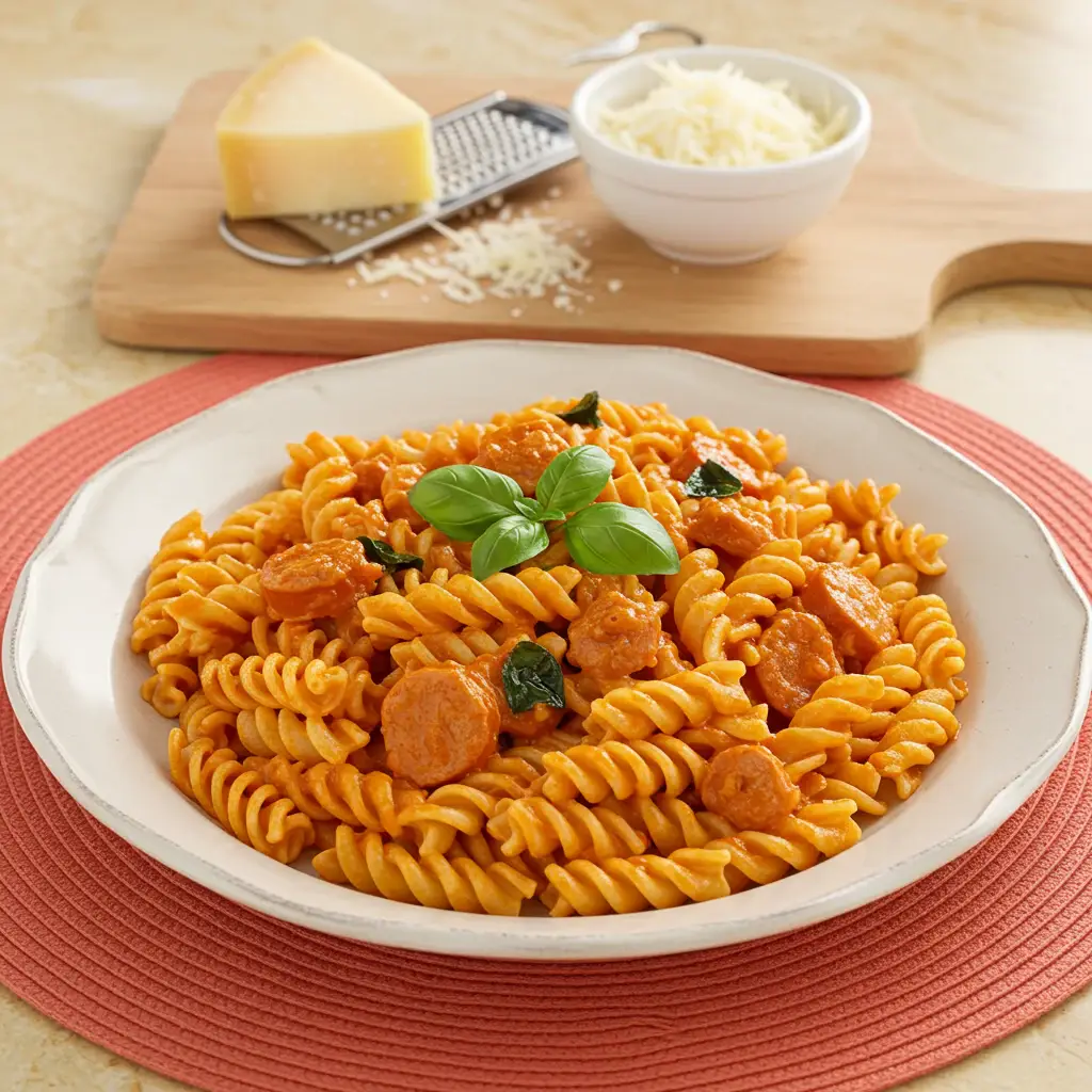 Um prato saboroso e reconfortante! A linguiça toscana defumada se junta a um molho cremoso de tomate, envolvendo perfeitamente o fusilli. Uma explosão de sabores que vai te conquistar!