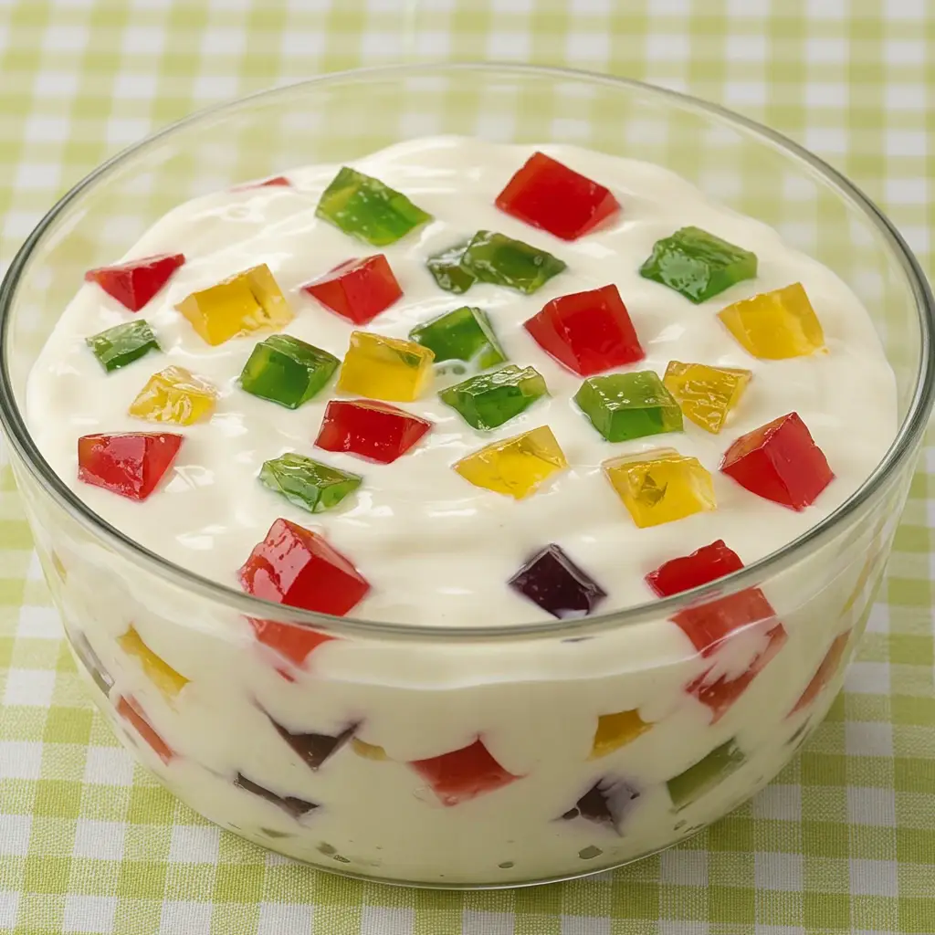 Adicione os cubos de gelatina colorida reservada, misturando delicadamente.
