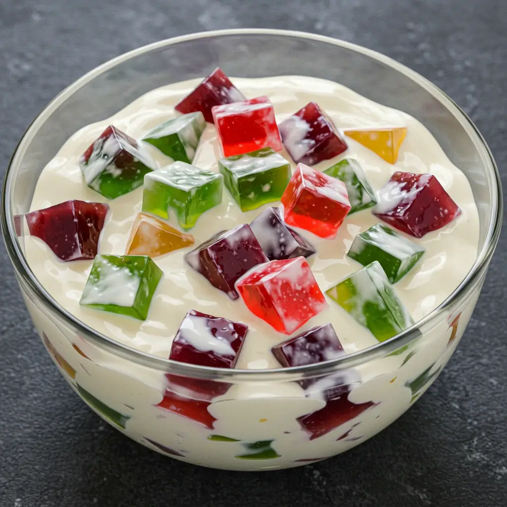 Despeje a mistura cremosa sobre os cubos de gelatina no refratário.