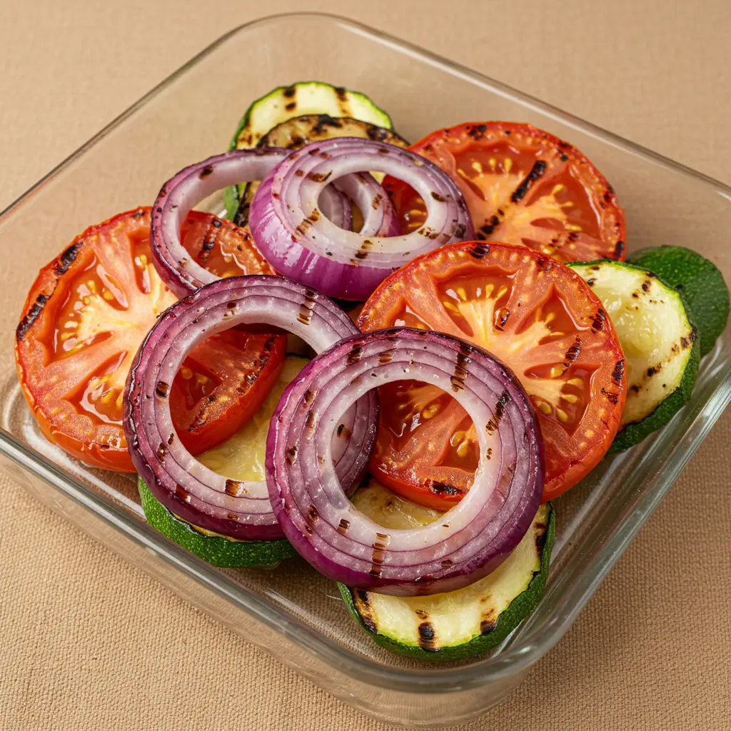 Um mix saboroso de berinjela, abobrinha, cogumelos e tomates grelhados, perfumados com alho e azeite. Acompanhamento perfeito para carnes, massas ou um lanche rápido e saudável.
