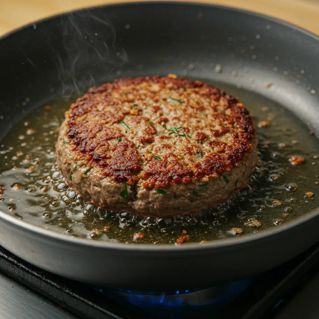 Aqueça uma frigideira grande com um fio de óleo em fogo médio. Frite os hambúrgueres por aproximadamente 5 a 7 minutos de cada lado, ou até estarem dourados e cozidos por dentro. Para um resultado mais uniforme, utilize uma espátula para pressionar levemente os hambúrgueres durante a fritura.