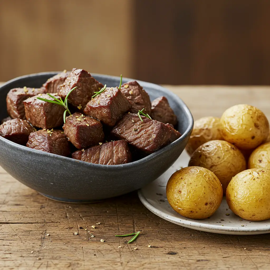 Iscas de Contrafilé ao Molho de Alecrim com Batatas ao Murro