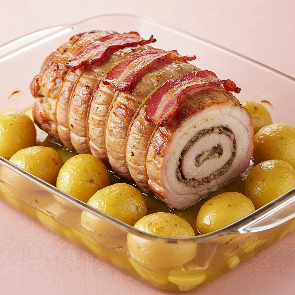 Após o cozimento, retire o lagarto da panela e reserve o caldo. Coloque as fatias de bacon sobre a carne e leve ao forno por 20 minutos, ou até o bacon ficar crocante.