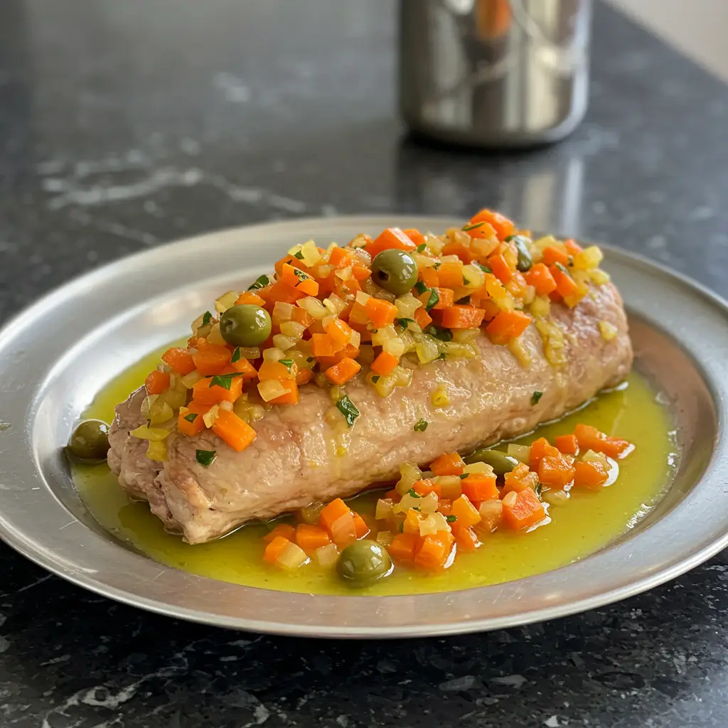 Um lagarto macio e saboroso, cozido na pressão e finalizado com um molho rico em vinagre, azeitonas e ervas frescas. Ideal como prato principal ou entrada sofisticada.