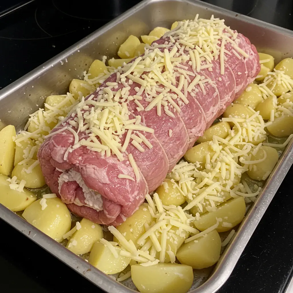 Um prato brasileiro cheio de sabor! Lagarto suculento recheado com bacon e mussarela, acompanhado de batatas assadas e um toque de queijo derretido. Uma combinação perfeita para um almoço ou jantar especial.