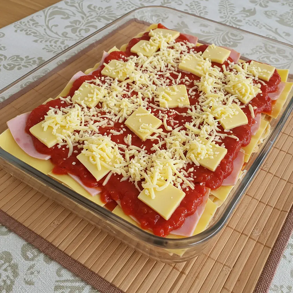 Cubra com metade do queijo prato fatiado, metade do presunto e mais uma camada de molho de tomate.