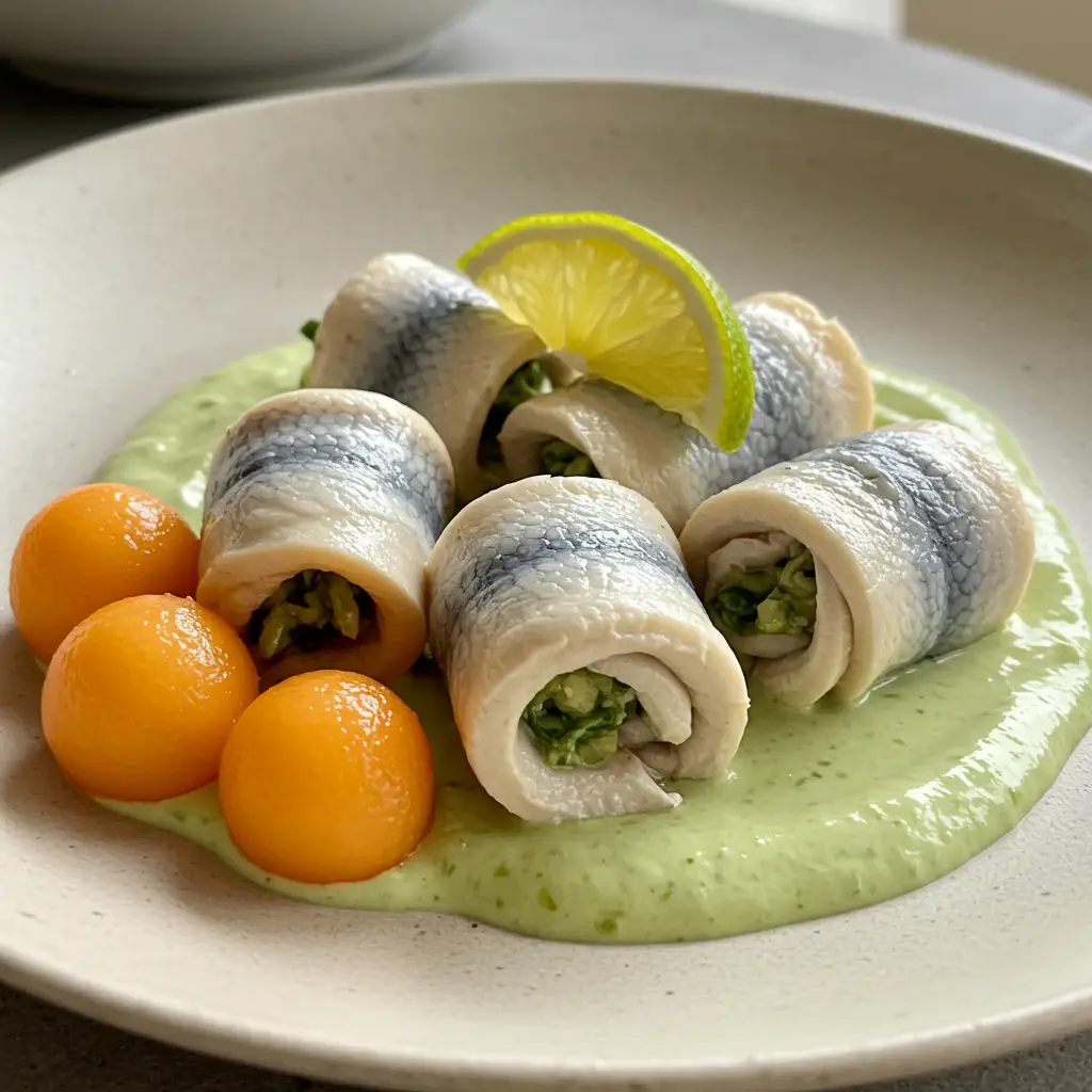Arrume os rolinhos de linguado e as bolinhas de melão nos pratos. Cubra com o molho cremoso.