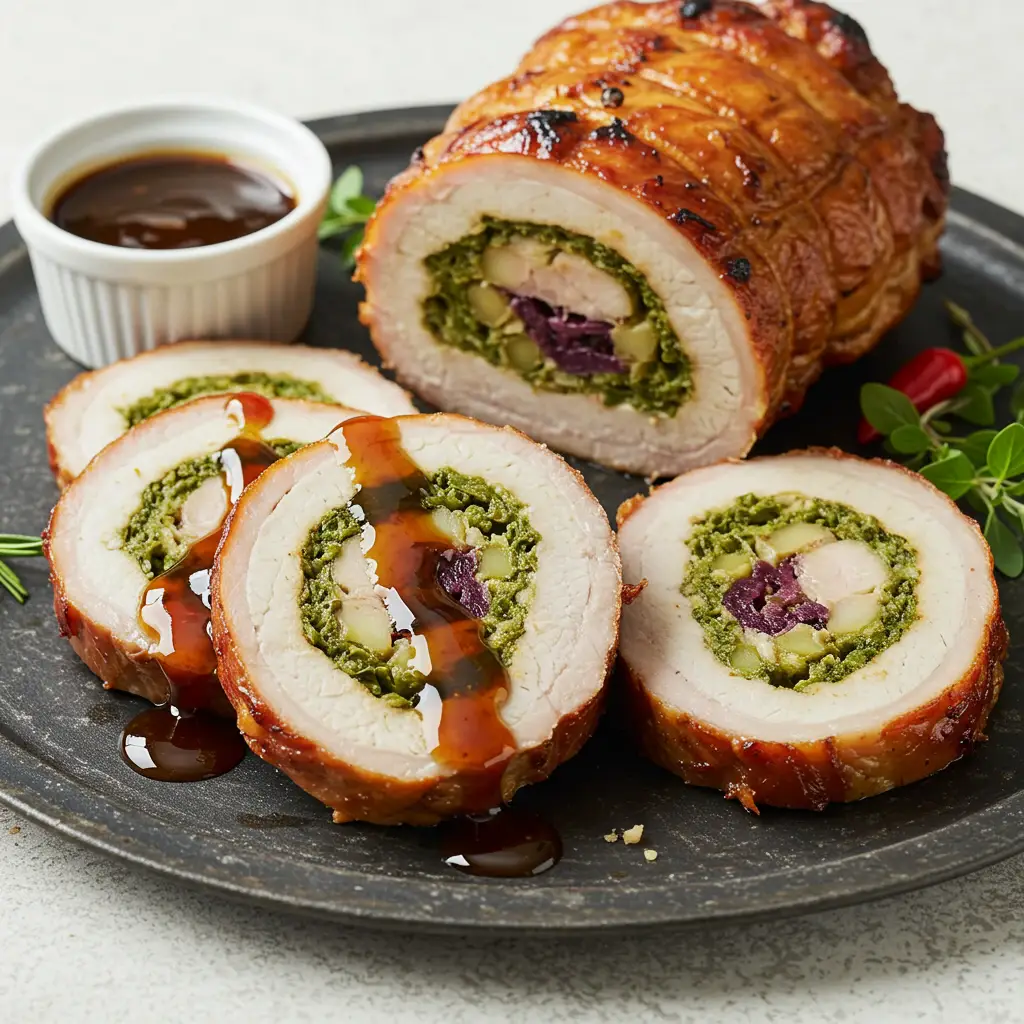 Lombo de Porco Recheado com Azeitonas, Alcaparras e Cogumelos