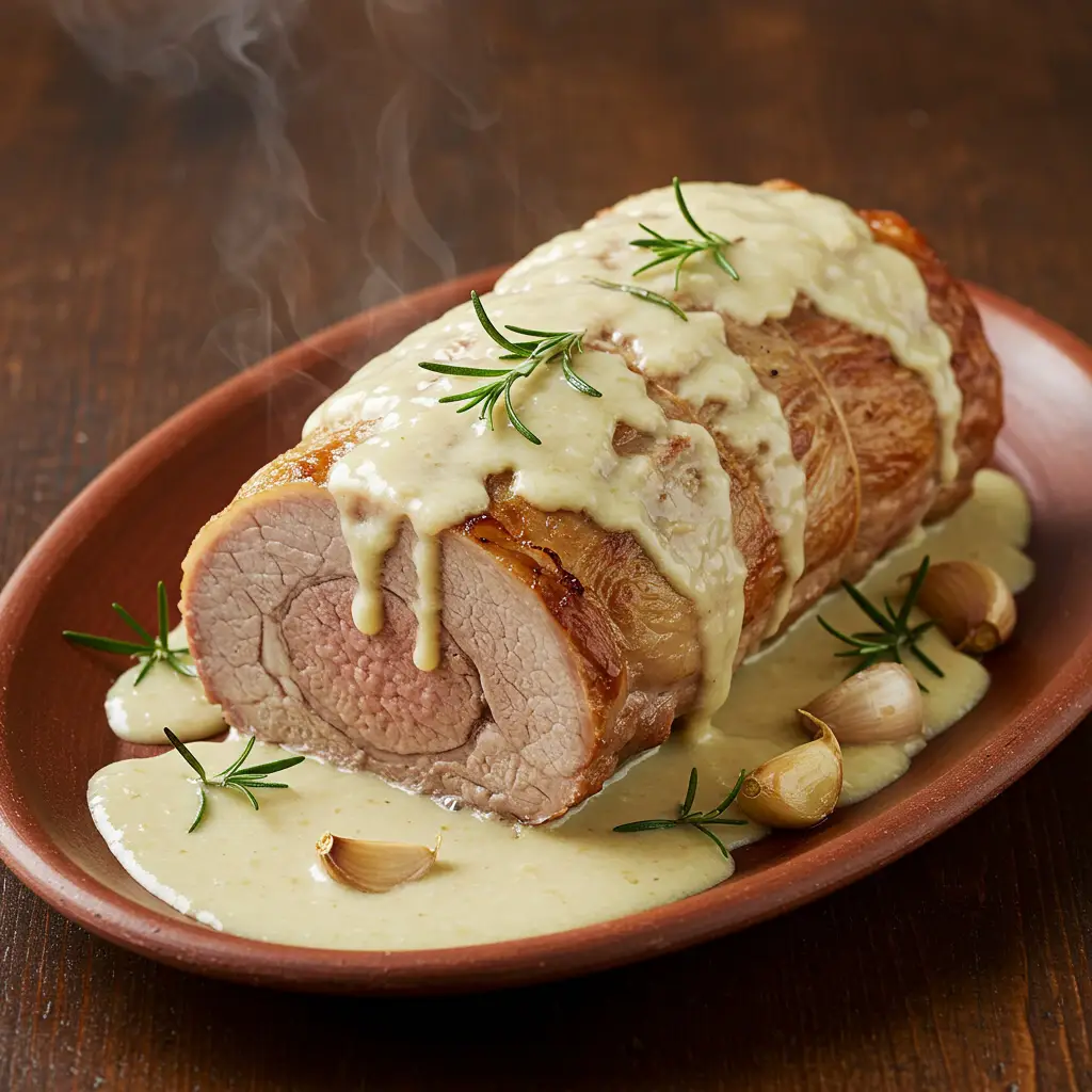 Um lombo de vitela suculento e saboroso, assado lentamente no forno com um delicioso molho branco aromatizado com alecrim e alho. Perfeito para um jantar especial!