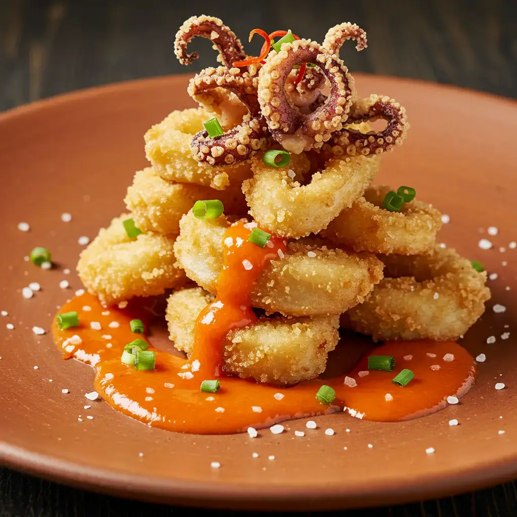 Em um prato, coloque uma porção generosa da geleia de tomate. Disponha as lulas fritas sobre a geleia.