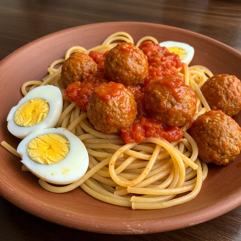 Um prato prático e saboroso, perfeito para um jantar rápido e reconfortante. Almôndegas suculentas de frango, macarrão ao dente e ovos cozidos, uma combinação clássica que agrada a todos.