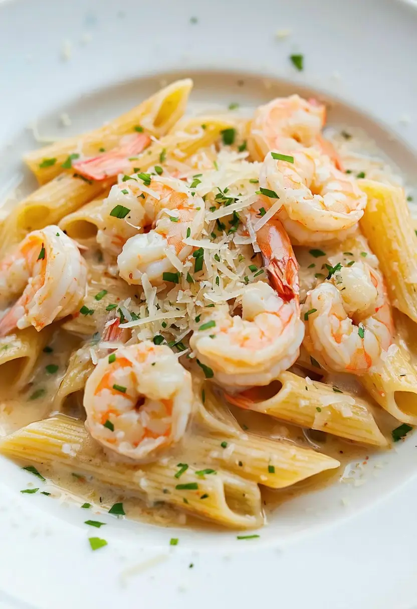 Delicie-se com este macarrão cremoso e saboroso, repleto de camarões suculentos e um molho irresistível. Uma combinação perfeita que vai conquistar seu paladar!
