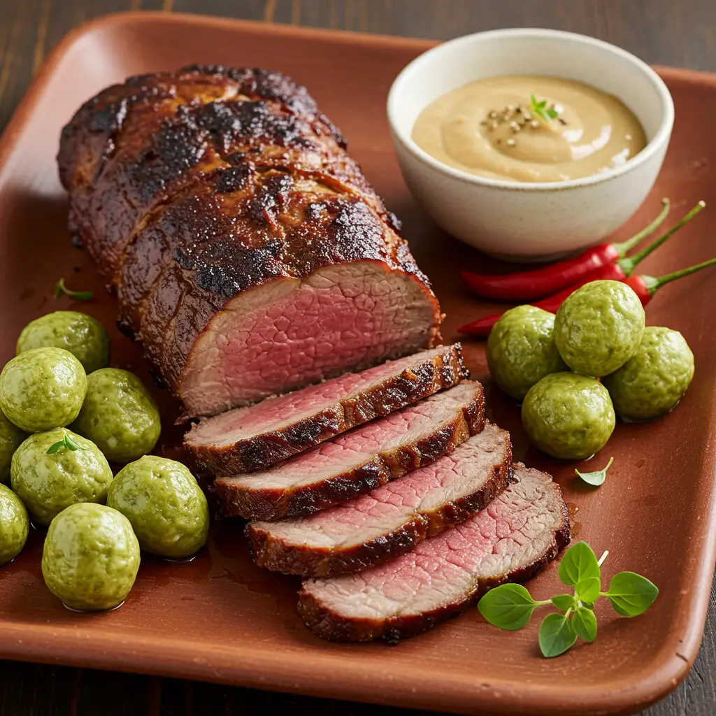 Uma maminha suculenta e saborosa, marinada em ervas frescas e molho inglês, acompanhada de um cremoso pirão de milho e pimentas cambuci. Um prato brasileiro que agrada a todos!