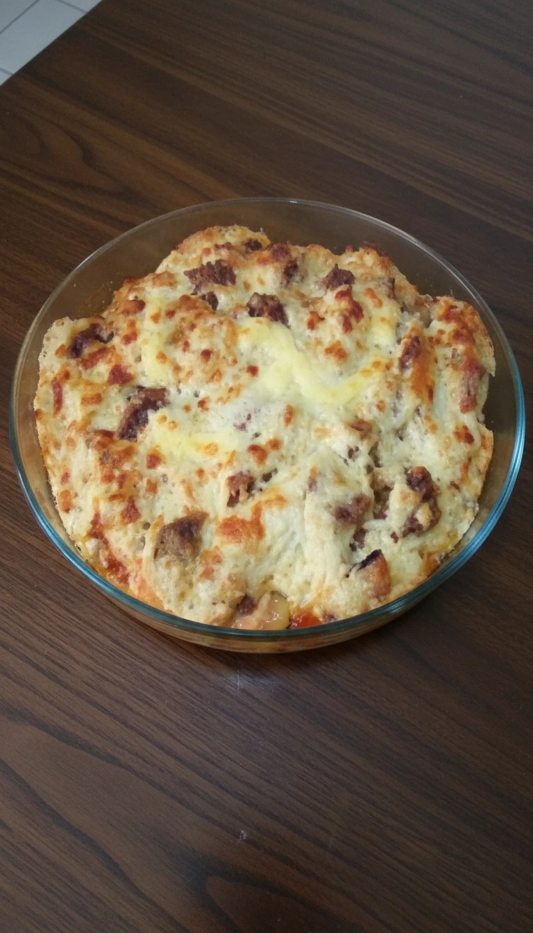 Em um refratário, espalhe uma camada do purê de batatas, formando uma manta.