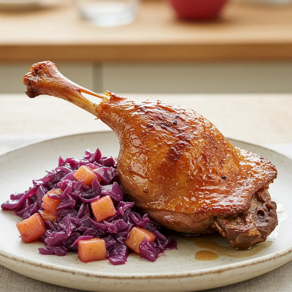 Um prato sofisticado e saboroso! Marreco assado com uma crosta crocante de bacon, acompanhado de um repolho roxo refogado com maçã, um toque de acidez e doçura que equilibra perfeitamente o sabor intenso do marreco.