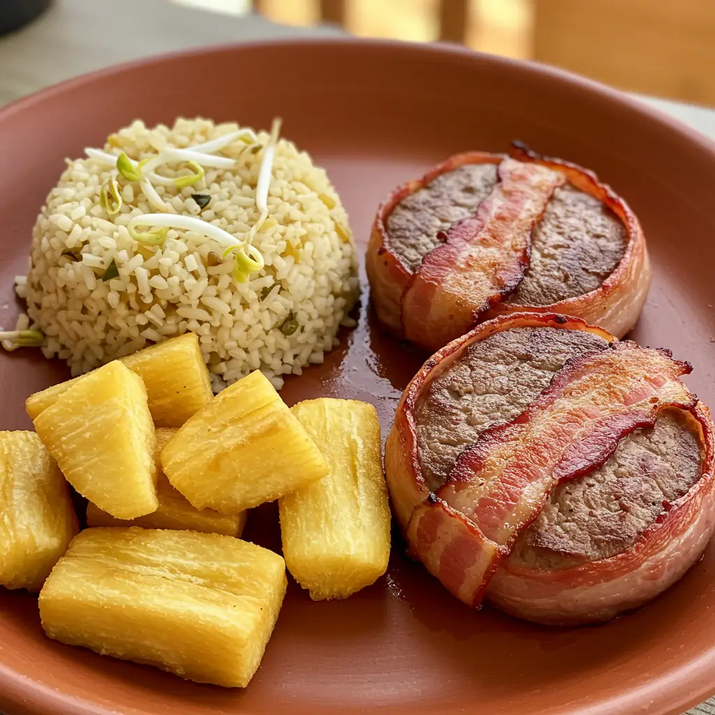 Delicioso medalhão de picanha grelhado, envolto em bacon crocante, acompanhado de arroz cremoso ao molho madeira, mandioca frita e brotos de feijão. Uma explosão de sabores!
