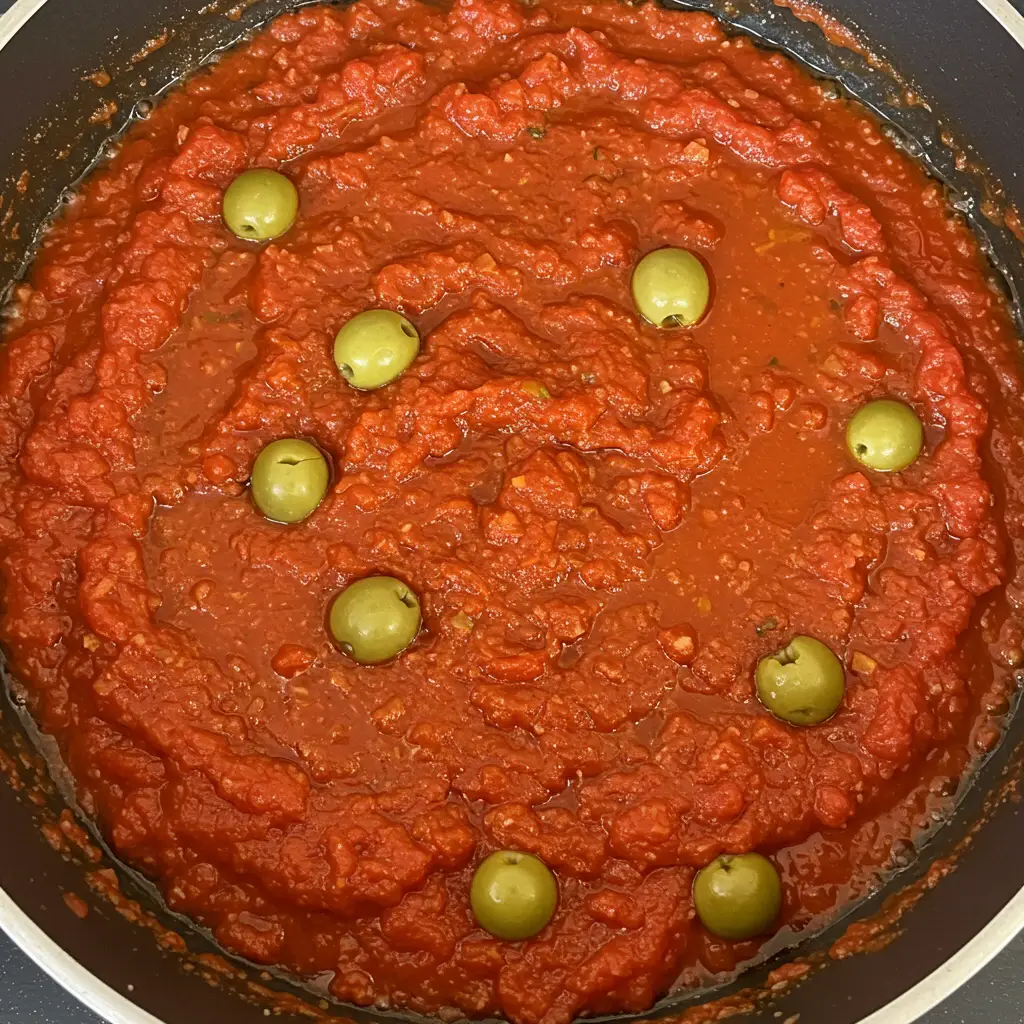 Adicione o cheiro verde, as azeitonas, a folha de louro e o molho de tomate pronto.