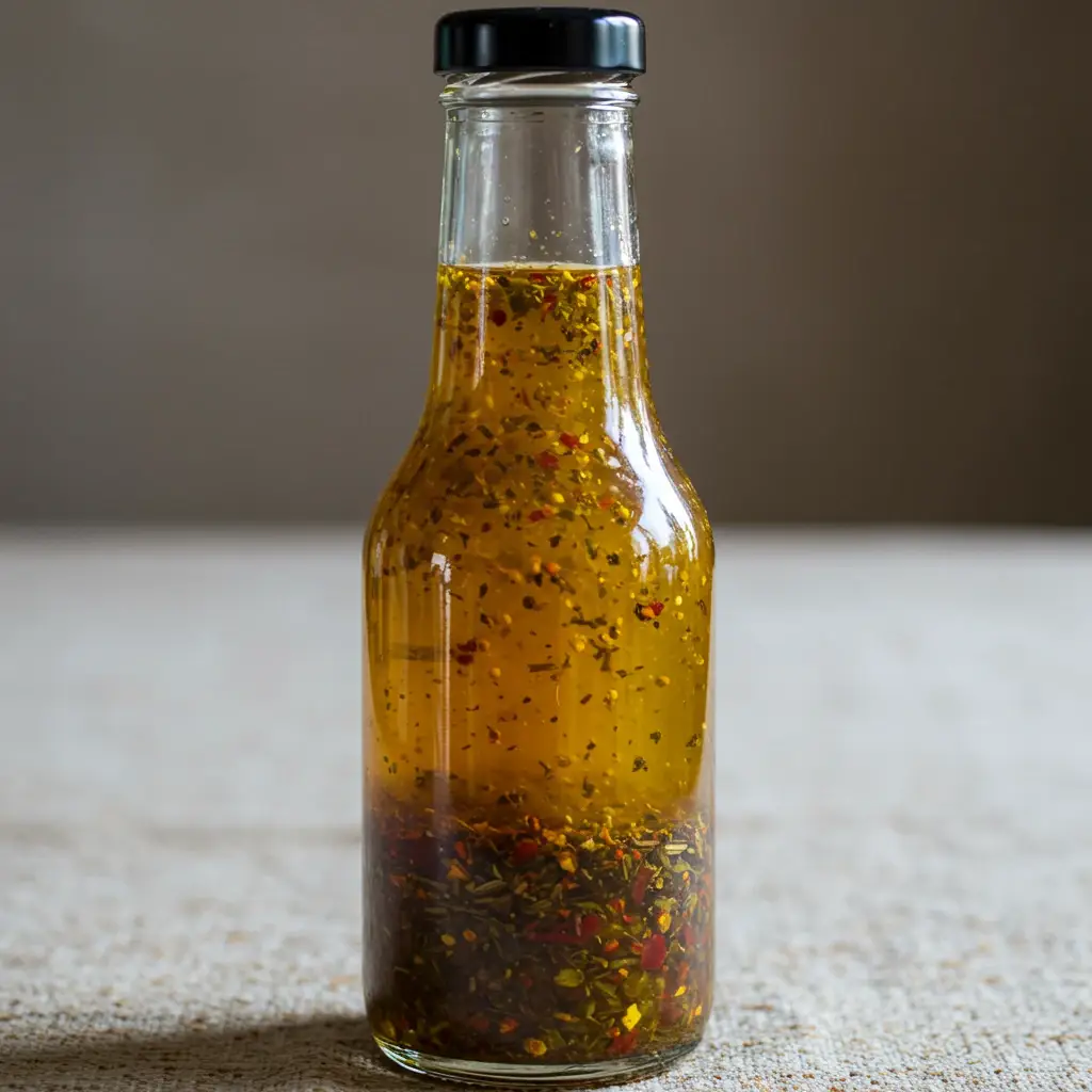 Em um recipiente de vidro, como um frasco de azeite, adicione todos os ingredientes.