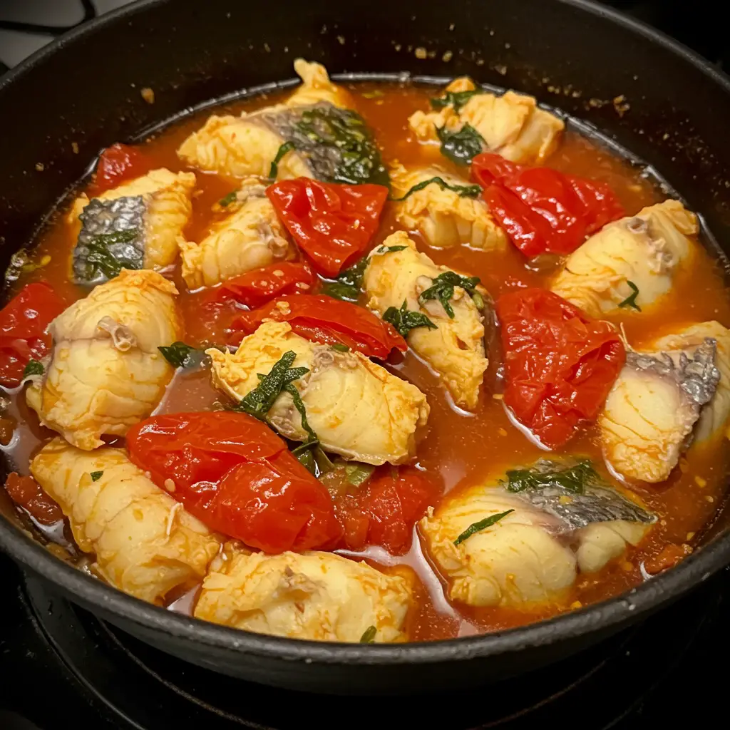 5. Finalize: Cozinhe por mais 30 minutos, ou até o peixe estar macio. Mexa a panela suavemente, balançando-a, para o peixe não grudar. Não use colher para não desmanchar o peixe.