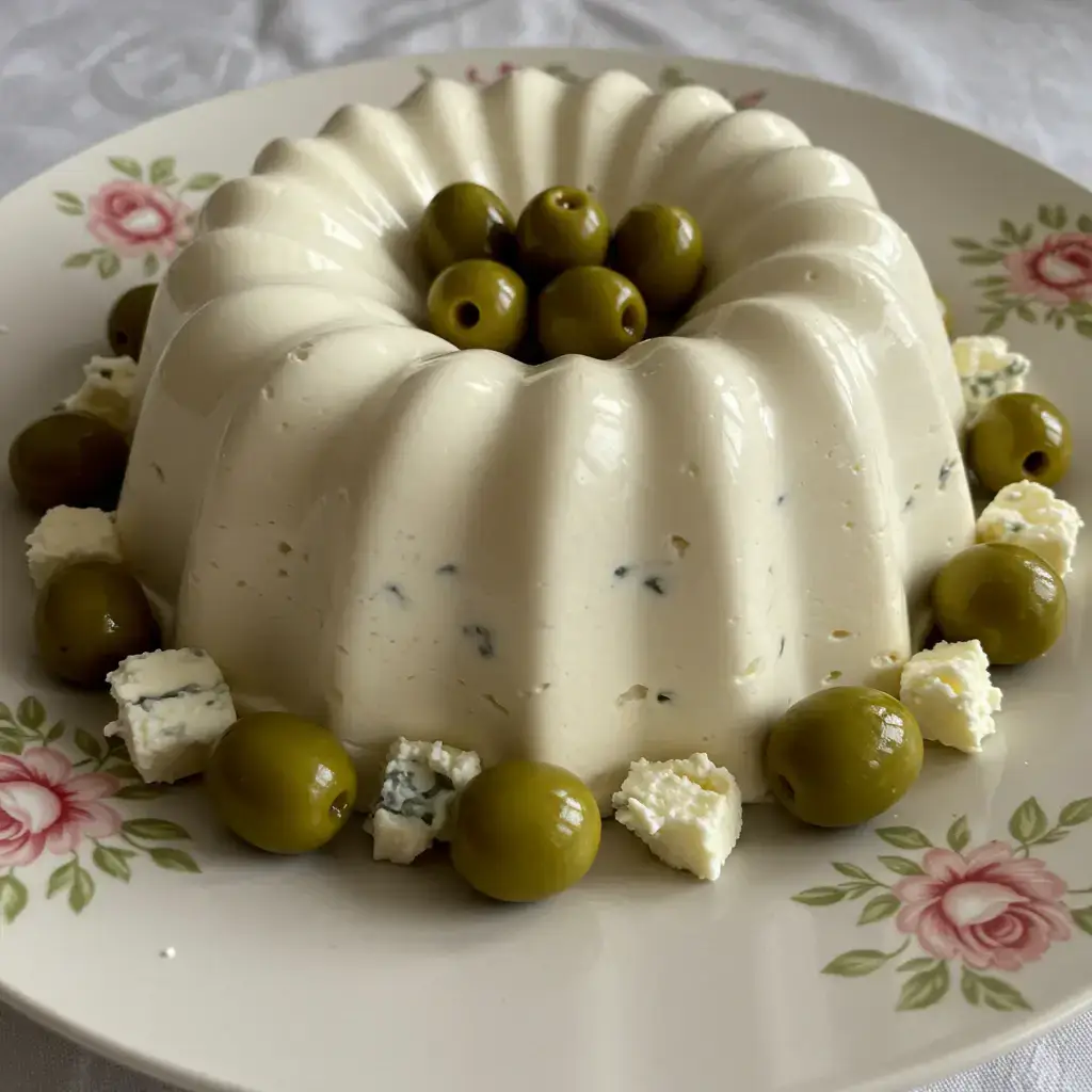 Desenforme o mousse com cuidado e decore a gosto com azeitonas pretas fatiadas e lascas de queijo gorgonzola.