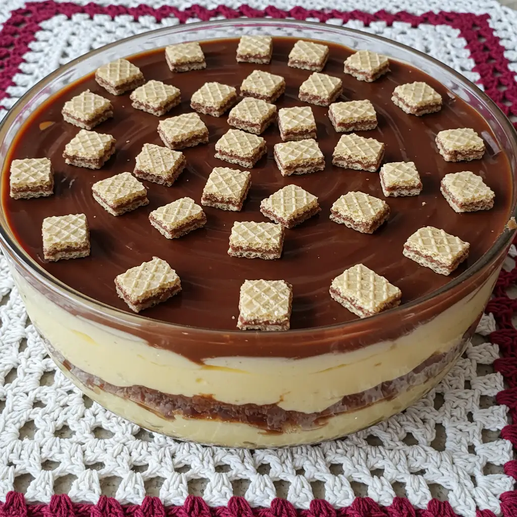 Delicie-se com esta mousse leve e refrescante de maracujá, coberta por um cremoso chocolate e decorada com biscoitos waffer, perfeita para qualquer ocasião.