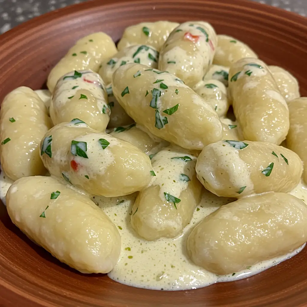 Um prato saboroso e fácil de preparar! Nhoque cremoso com peito de peru, finalizado com um toque especial de chimichurri e queijo parmesão gratinado.