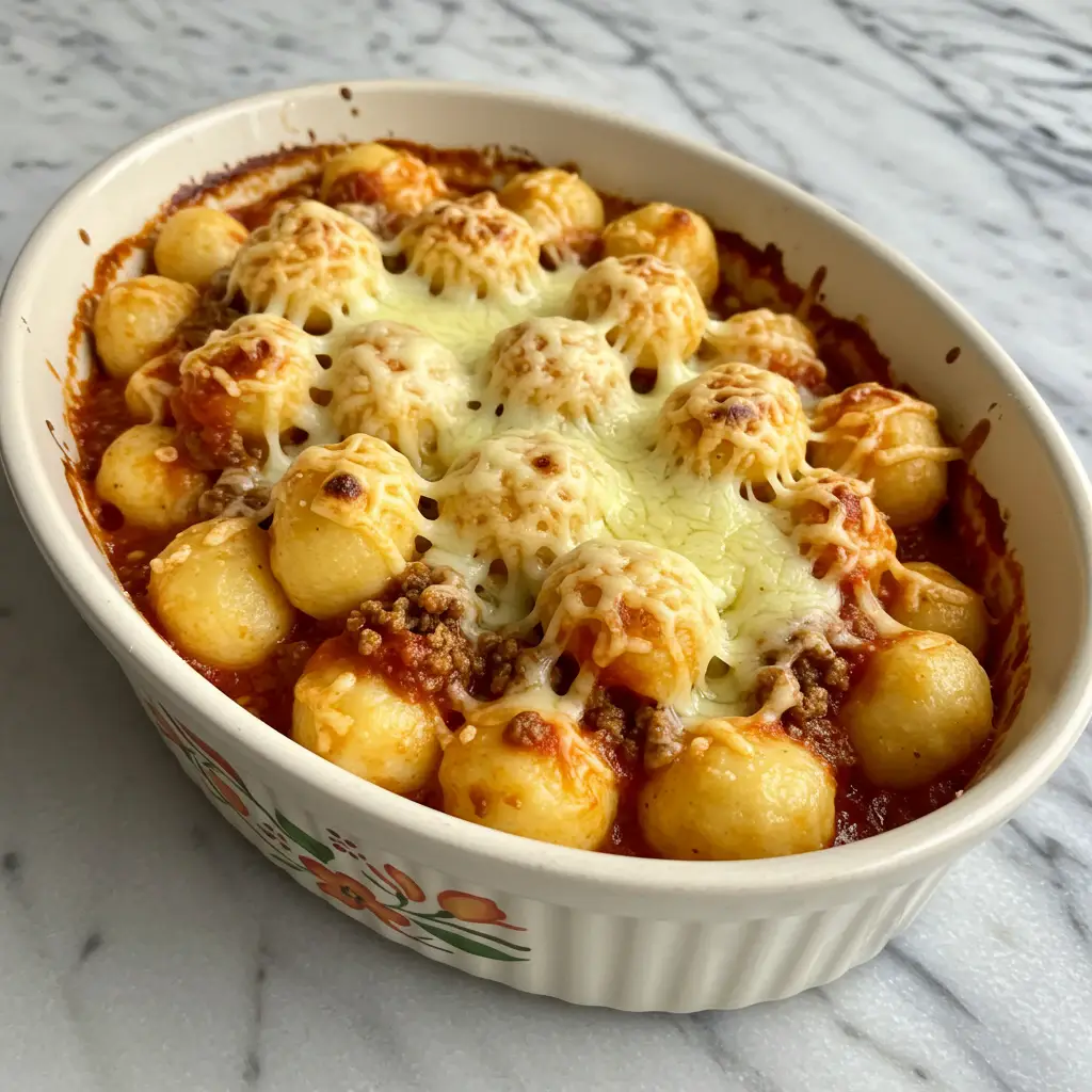 Em um refratário, disponha os nhoques. Cubra com o molho e polvilhe com queijo ralado.