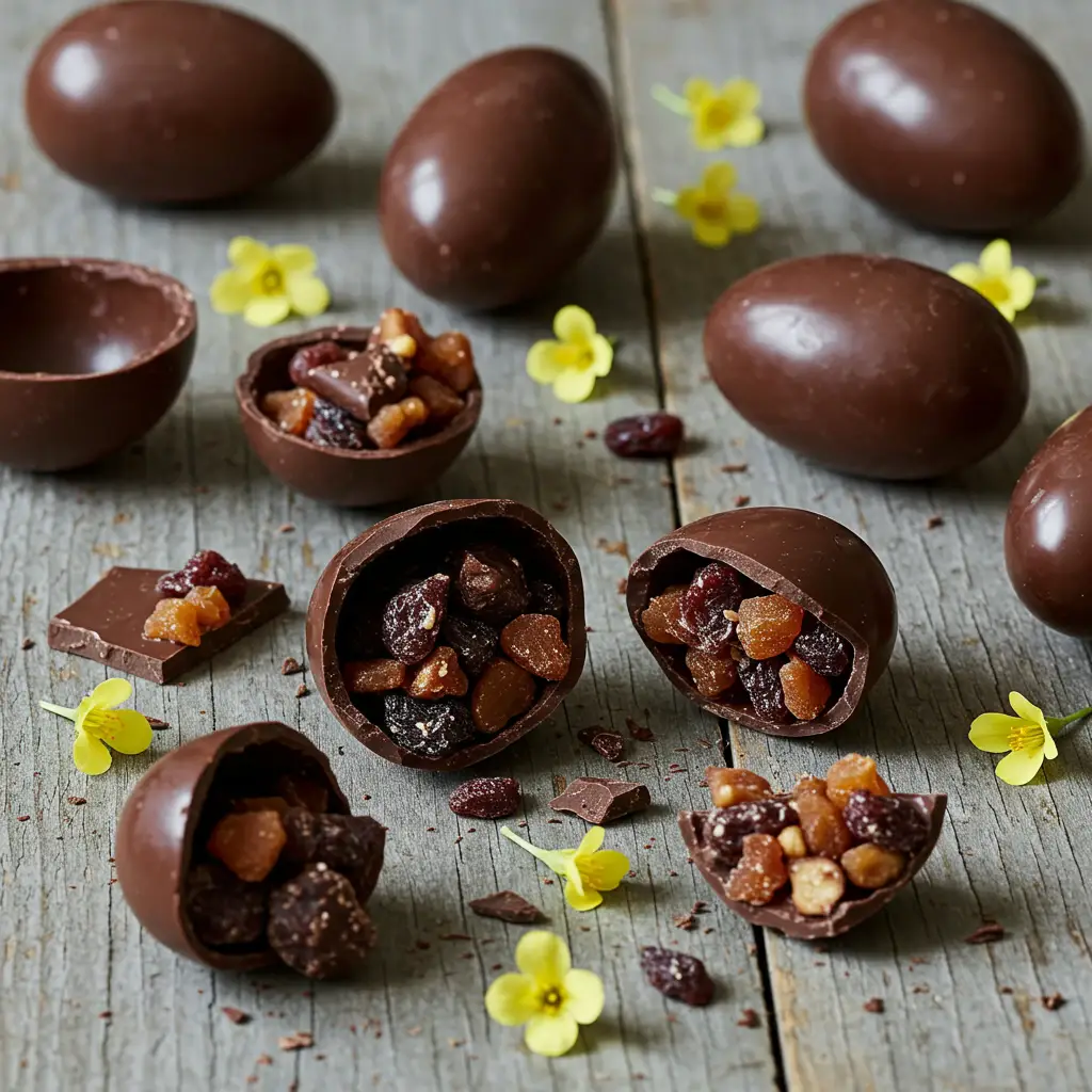 Deliciosos ovos de Páscoa caseiros, com chocolate meio amargo cremoso e um irresistível mix de frutas secas. Uma receita fácil e perfeita para presentear ou saborear!