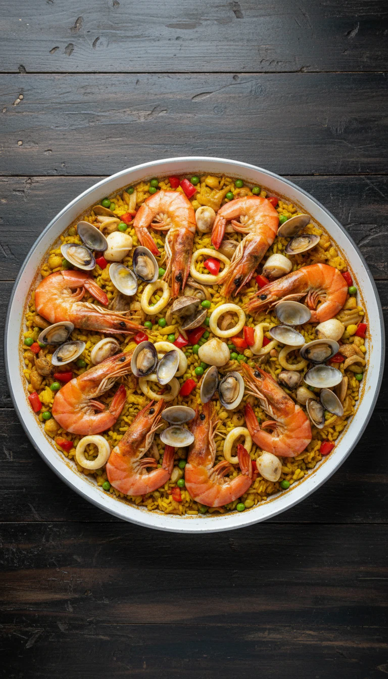 Uma paella exuberante, repleta de frutos do mar frescos e saborosos. Arroz soltinho e temperos vibrantes criam uma experiência gastronômica inesquecível. Ideal para um almoço especial ou jantar festivo.