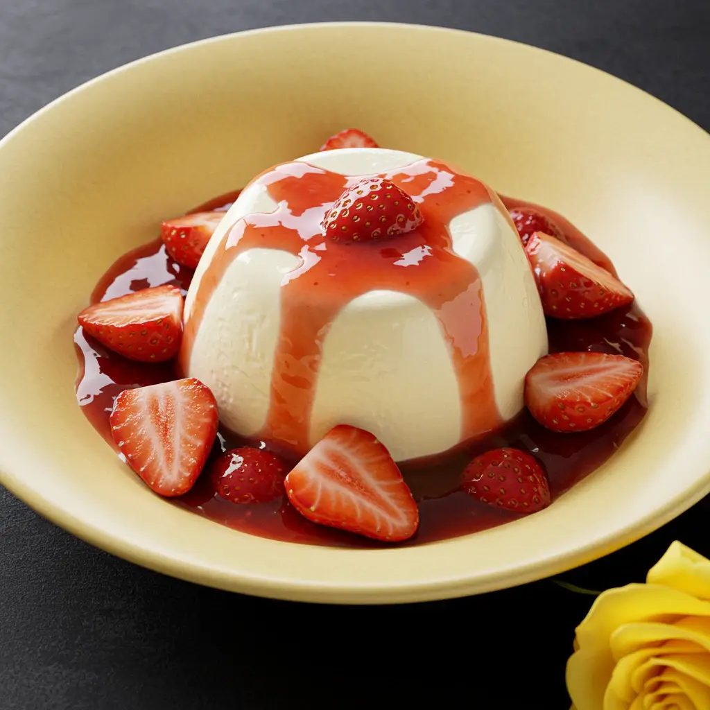 Cremosa panna cotta com sabor delicado de baunilha, finalizada com uma irresistível calda de morango. Uma sobremesa elegante e perfeita para encantar seus convidados.