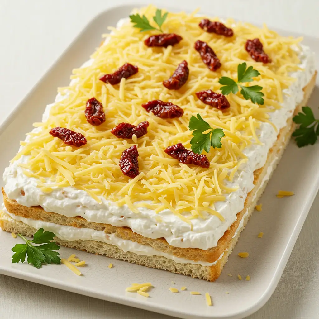 Um pão gelado irresistível! Camadas de pão de forma macio, recheio cremoso de atum, e um toque especial de queijo parmesão. Perfeito para um lanche ou aperitivo.