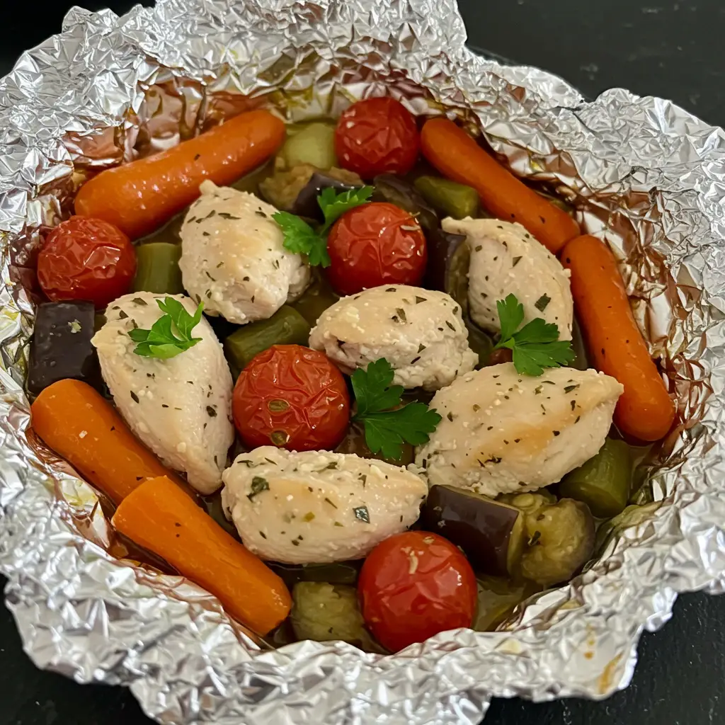 Um prato leve e saboroso, ideal para um jantar especial. Frango suculento envolvido em legumes frescos e aromáticos, assado em papillote para preservar todos os sabores.