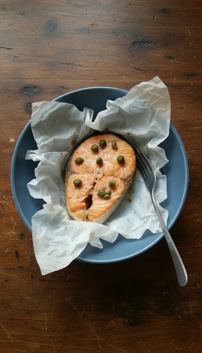 Deliciosos papillotes de salmão, envoltos em papel manteiga e assados no forno. Um sabor delicado e sofisticado, com o toque especial das alcaparras e mostarda.