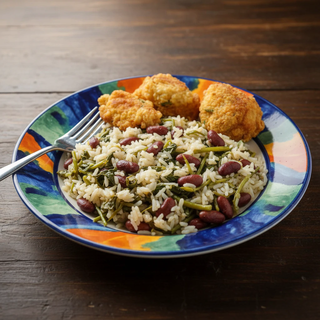 Pataniscas de Bacalhau com Arroz de Feijão e Grelos