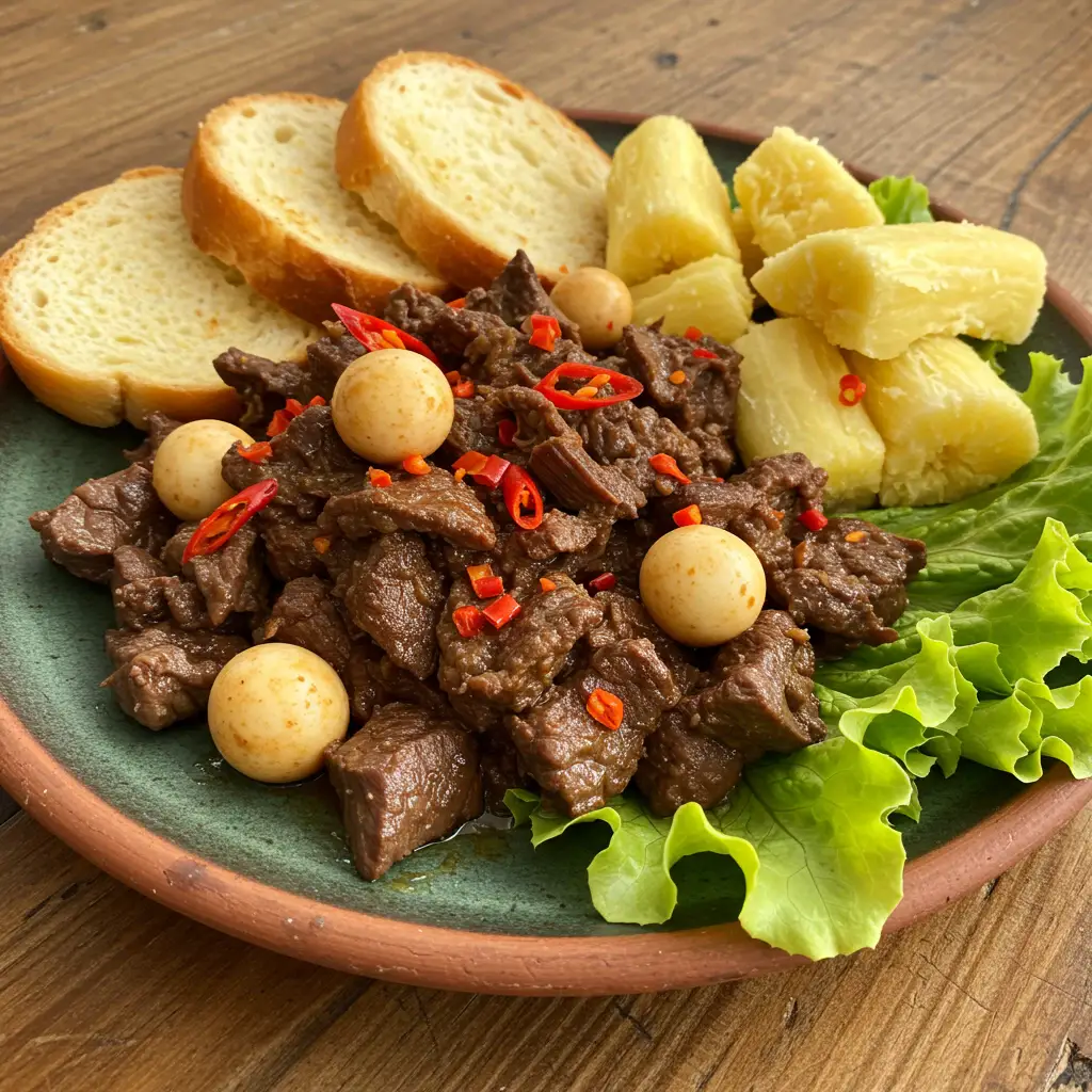 Um suculento patinho cozido na pressão com cerveja escura, creme de cebola e um toque picante de pimenta biquinho e dedo-de-moça. Acompanha mandioca e gergelim.