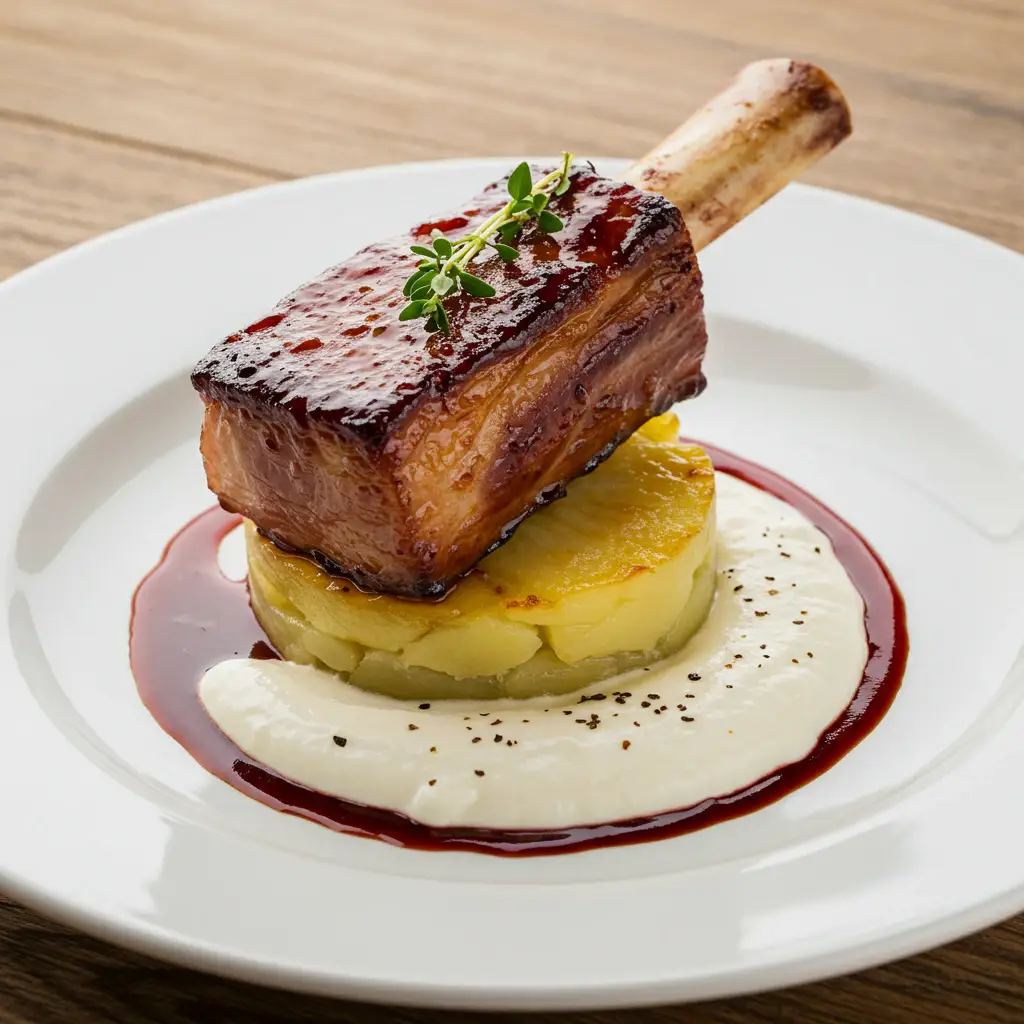 Uma combinação irresistível de pato confitado, acompanhado de maçãs assadas caramelizadas e um purê de batatas cremoso, que traz um toque especial ao seu jantar.
