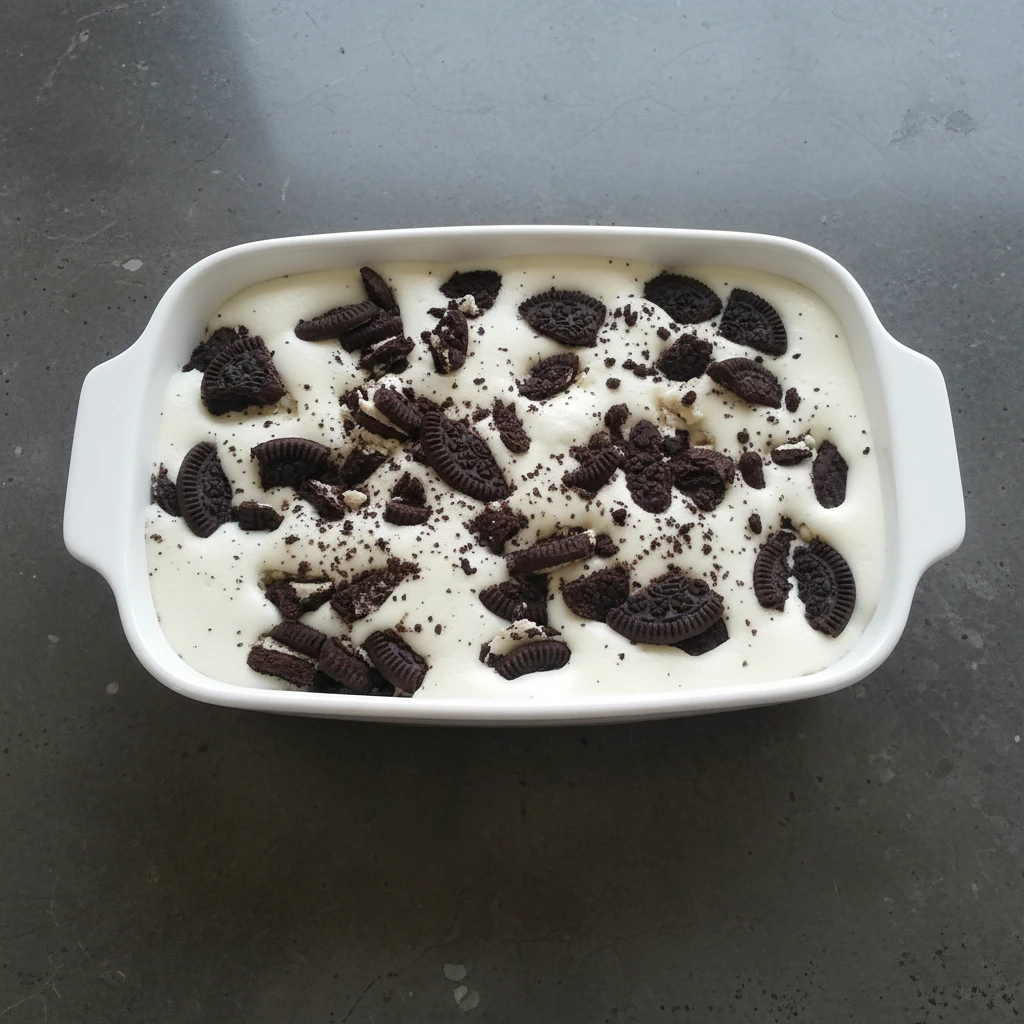 Despeje essa mistura sobre a camada de biscoitos na travessa.