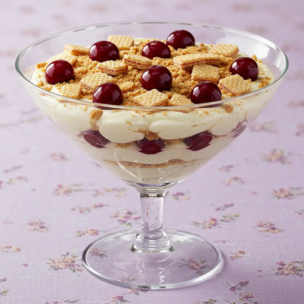 Um pavê irresistível com camadas de biscoito amanteigado, um creme de chocolate branco cremoso e delicado, finalizado com biscoito wafer e cerejas. Uma sobremesa perfeita para encantar seus convidados!