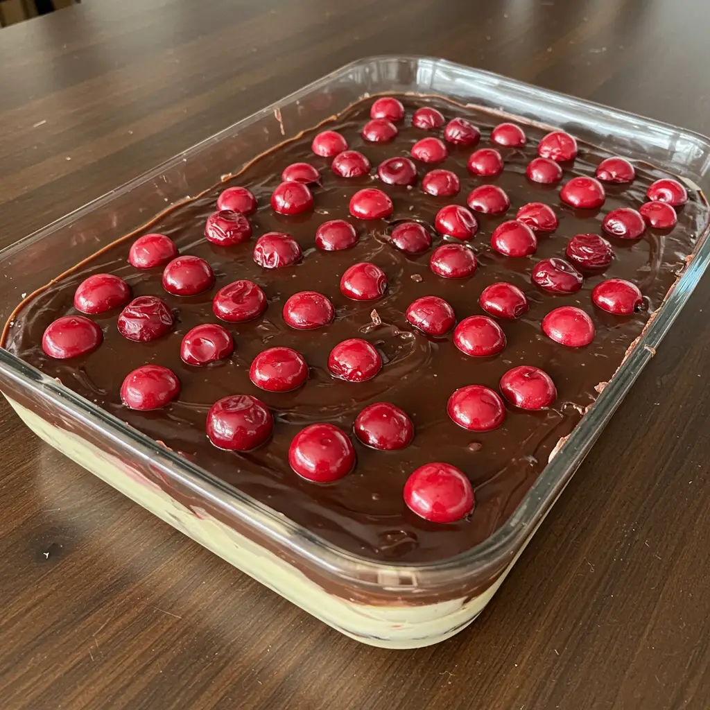 Monte o pavê: Em uma travessa, faça camadas alternadas de biscoitos champagne, creme branco, creme de chocolate e cerejas picadas. Comece e termine com uma camada de creme.