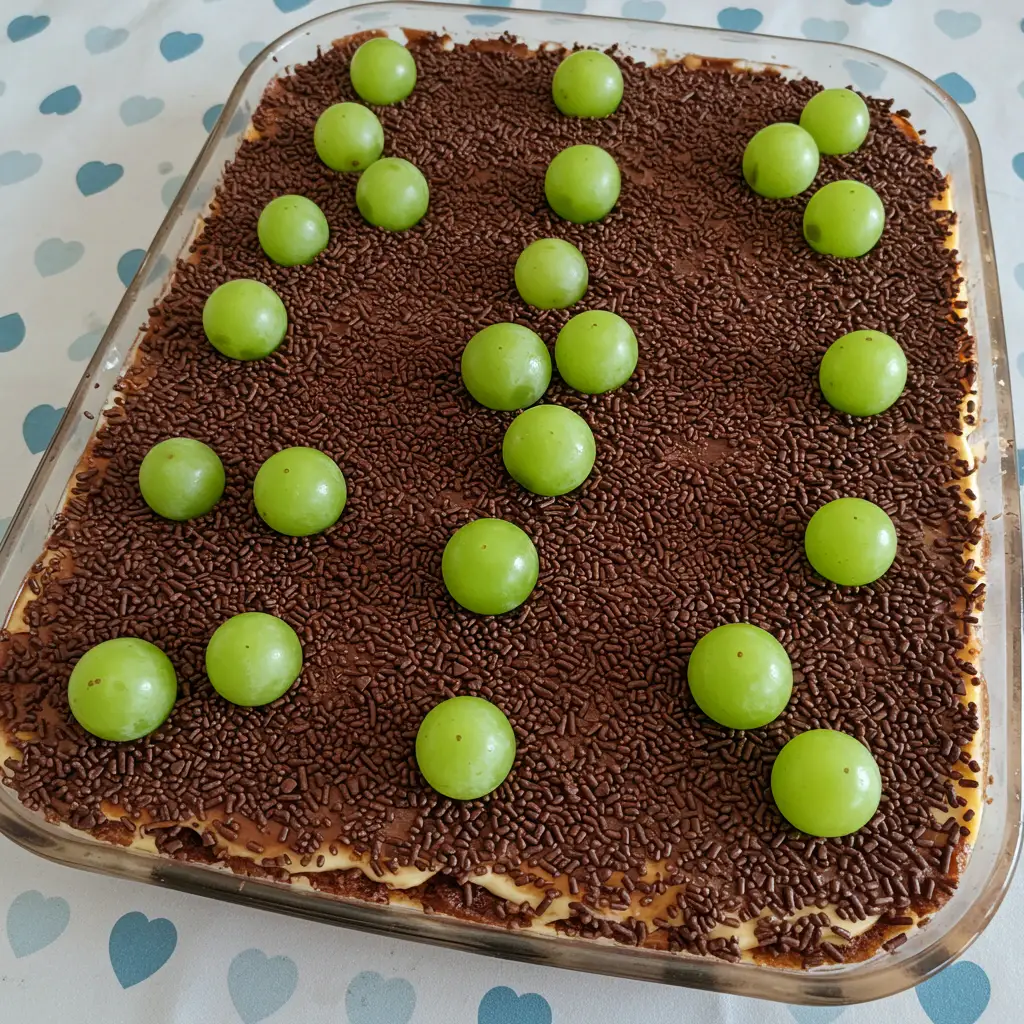 Finalize com uma camada de creme e decore com chocolate granulado e uvas cortadas ao meio.