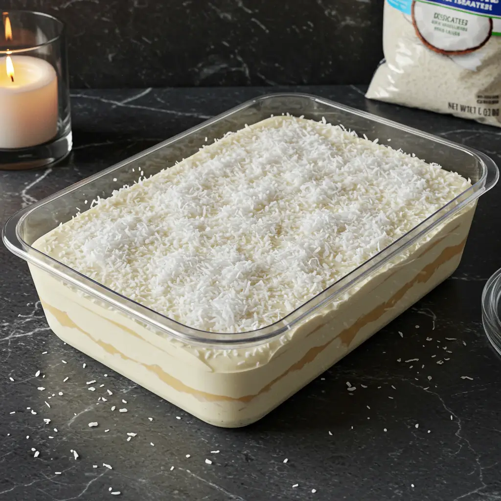 Cubra com o restante do creme de leite e polvilhe com o coco ralado restante (50g).