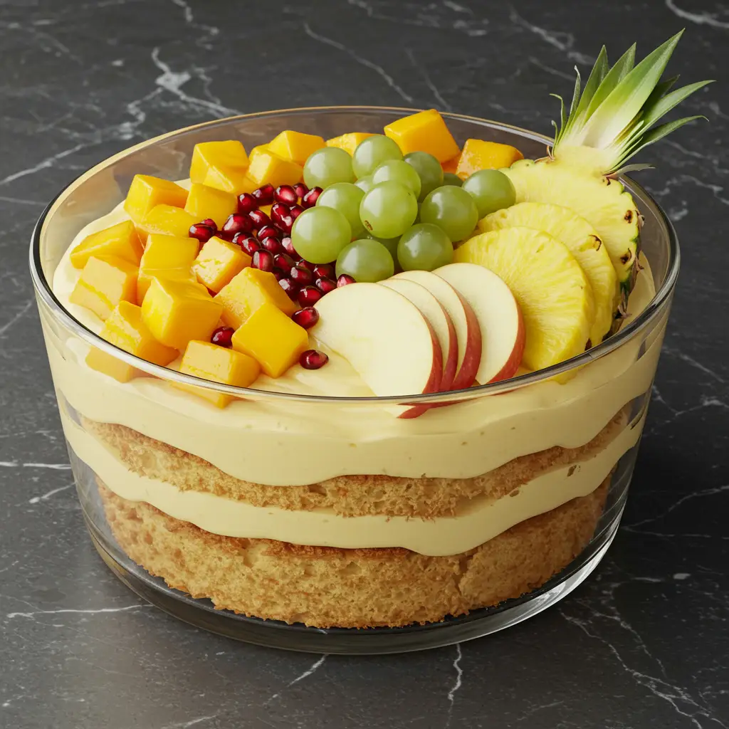 Em uma compoteira ou taças individuais, faça camadas alternadas de creme de pudim, cubos de pão de ló umedecidos na calda e frutas picadas (morangos, kiwis, manga e abacaxi). Comece e termine com a camada de frutas.