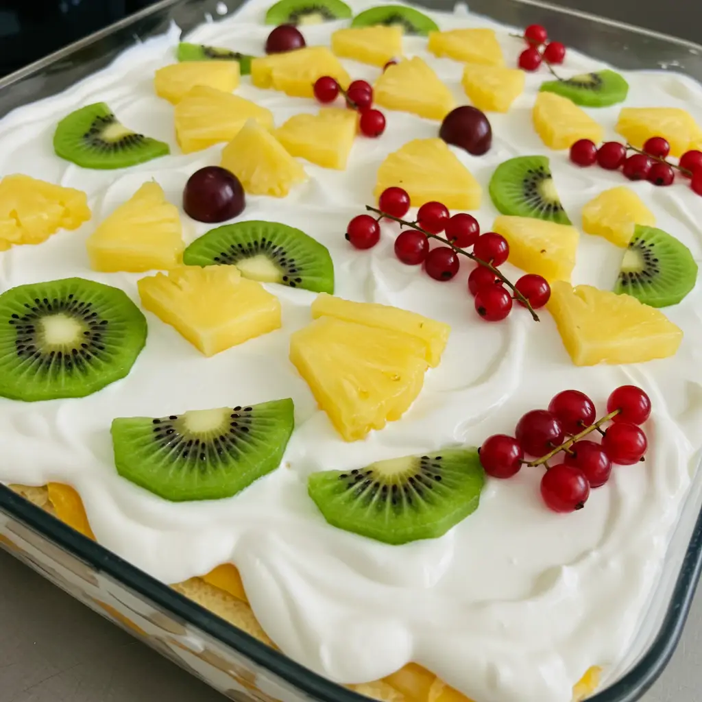 Um delicioso e refrescante pavê de frutas tropicais que combina o sabor doce do pêssego, morango, banana e abacaxi, com um creme leve e aerado. Perfeito para qualquer ocasião!