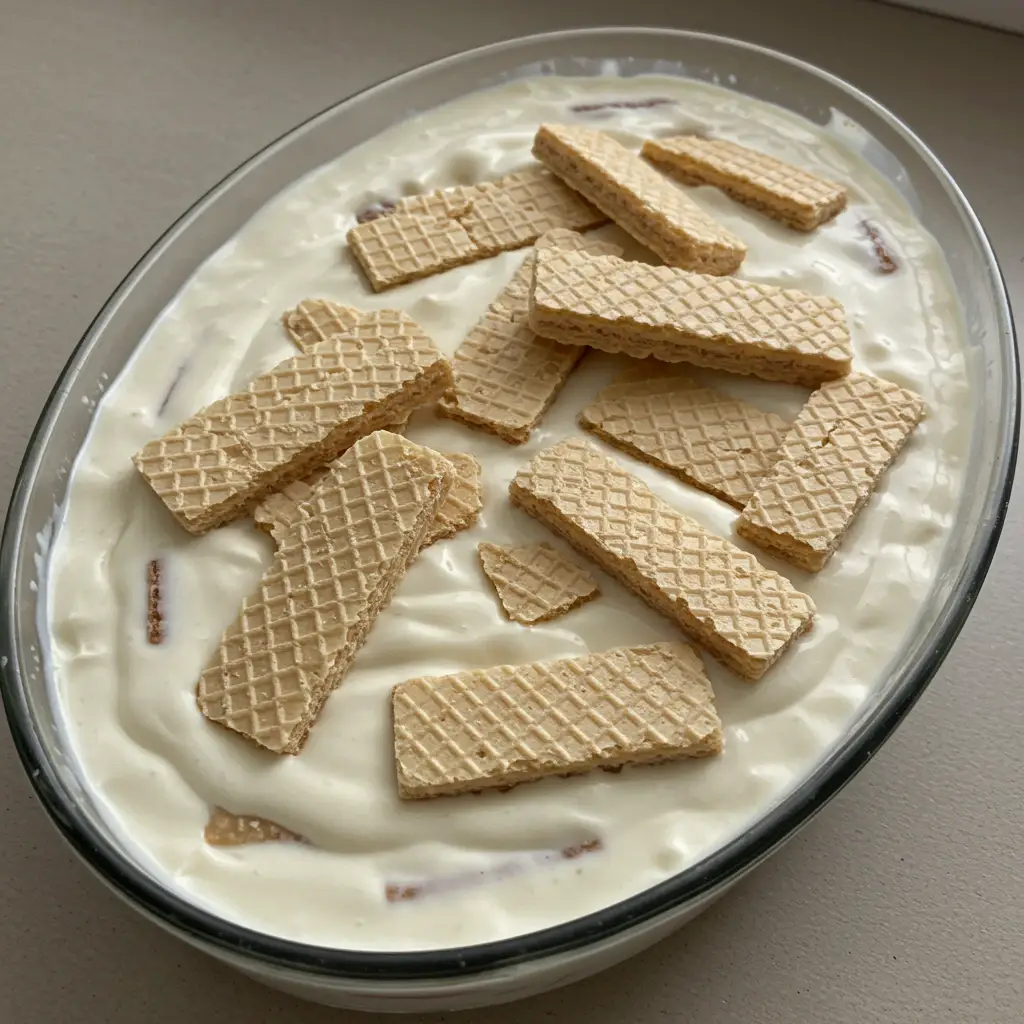 Repita o processo com outra camada de biscoitos umedecidos e adicione a outra metade do creme.